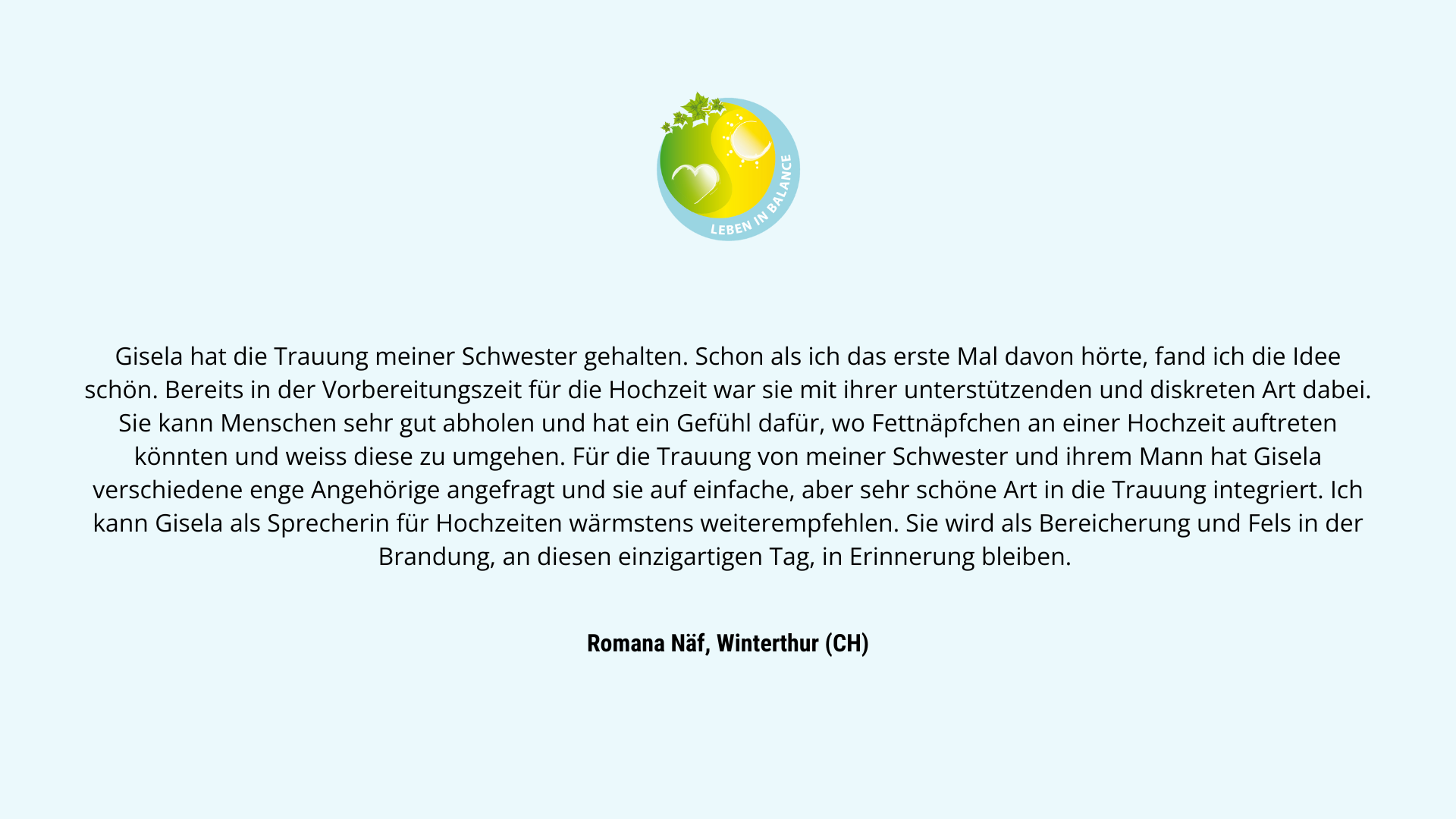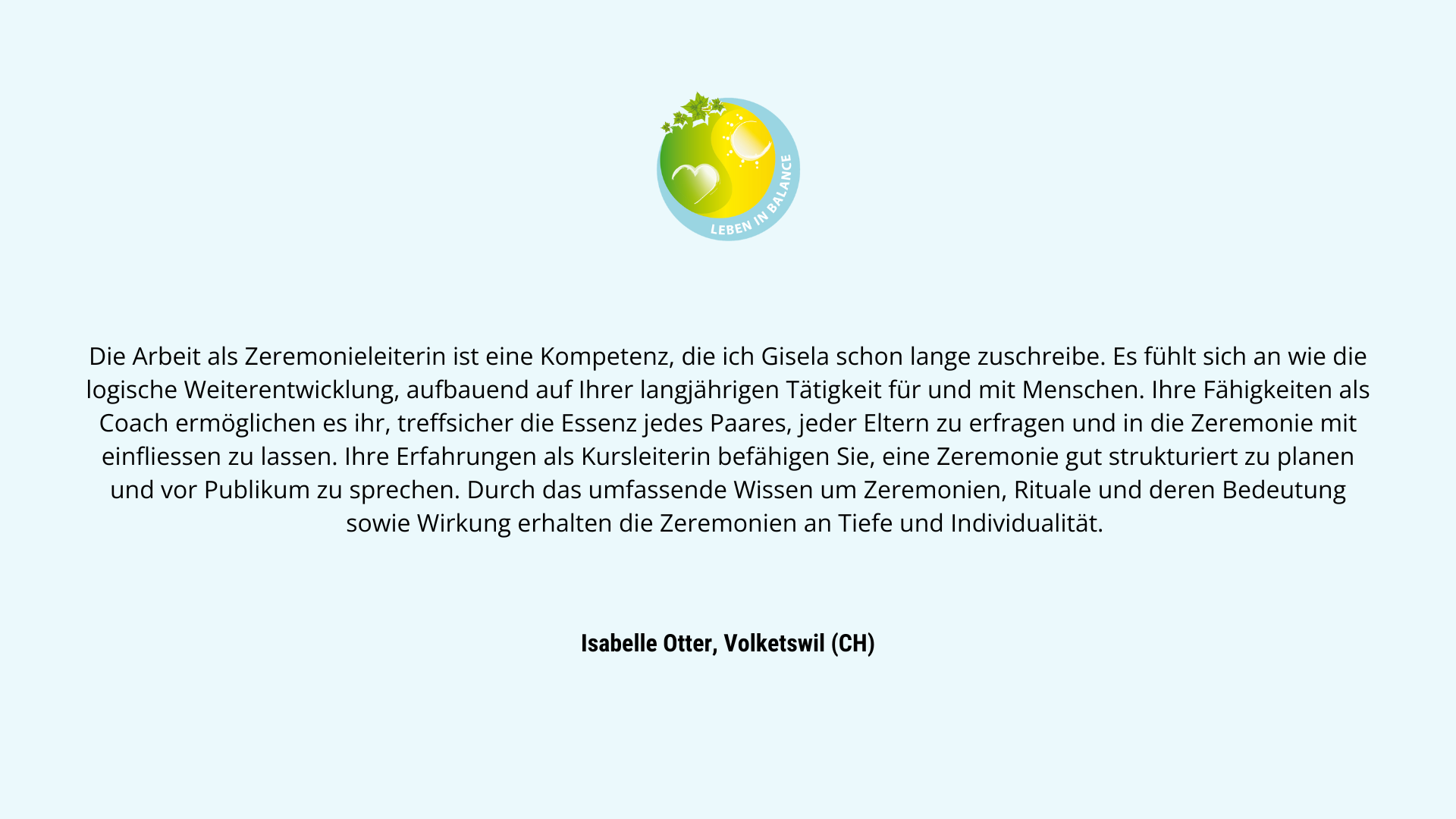 Die Begegnungen mit Menschen aus den unterschiedlichsten Lebenslagen, die ich durch meine Arbeit als Naturheilpraktikerin, Coach und Kursleiterin täglich machen darf, berühren mich immer wieder tief. Gerne möchte ich diesen Erfahrungsschatz mit Ihnen teilen, um Ihre ganz persönliche Trauung oder Taufe Wirklichkeit werden zu lassen.